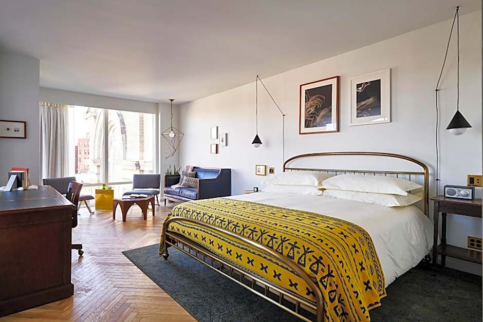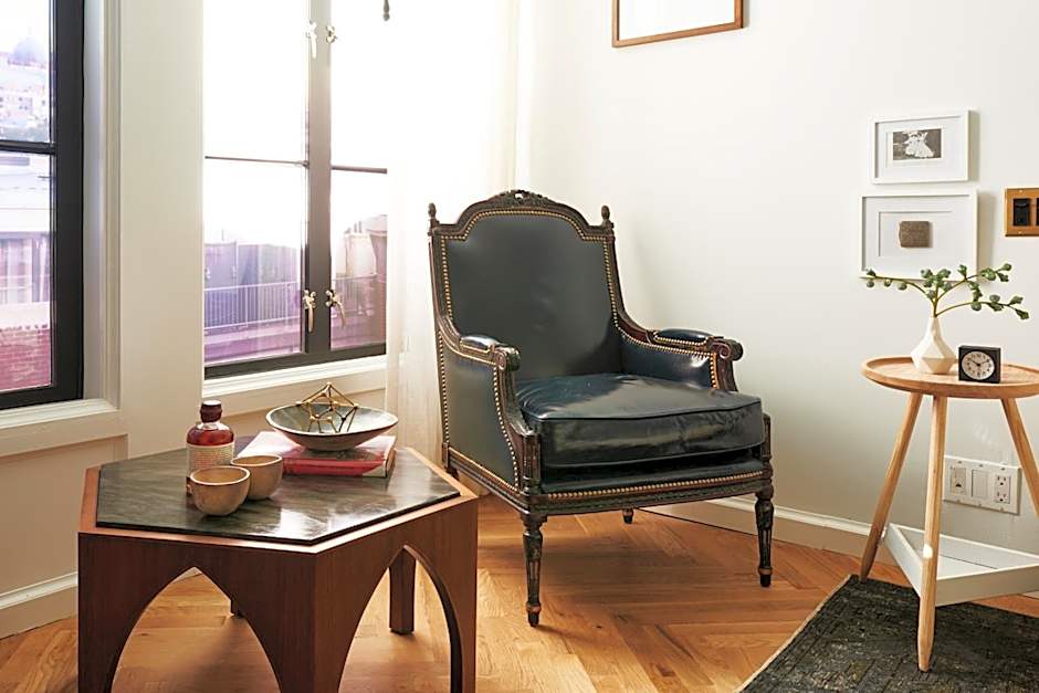 This Apartment Suite offers custom furnishings, a sofa, a working desk, handmade bath products, a curated micro library, mini-bar with local and international drinks and snacks, original artwork and photography and an old school radio.